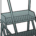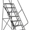 Steel rolling warehouse ladder with a 450lb load capacity. Features include a locking device and handrails.